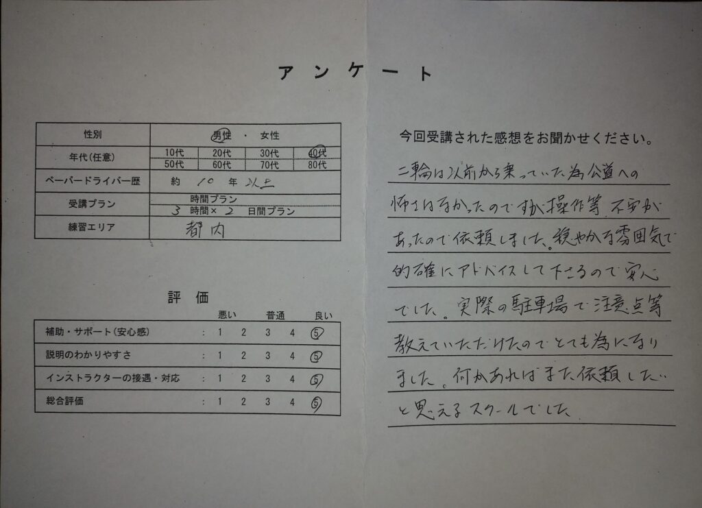 二輪は以前から乗っていた為、公道への怖さはなかったのですが、操作等、不安があったので依頼しました。穏やかな雰囲気で的確にアドバイスして下さるので安心でした。実際の駐車場で注意点等、教えていただけたのでとても為になりました。