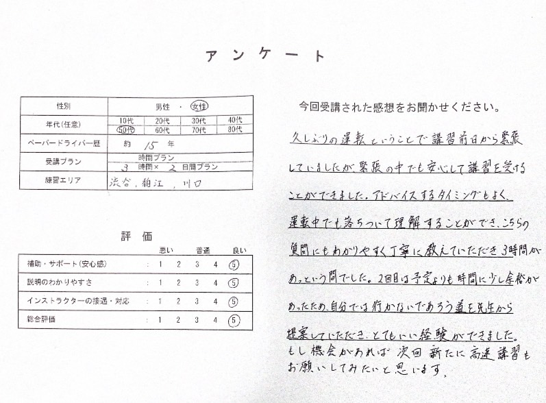 アドバイスのタイミングもよく運転中でも落ち着いて理解することができました(渋谷区のお客様)
