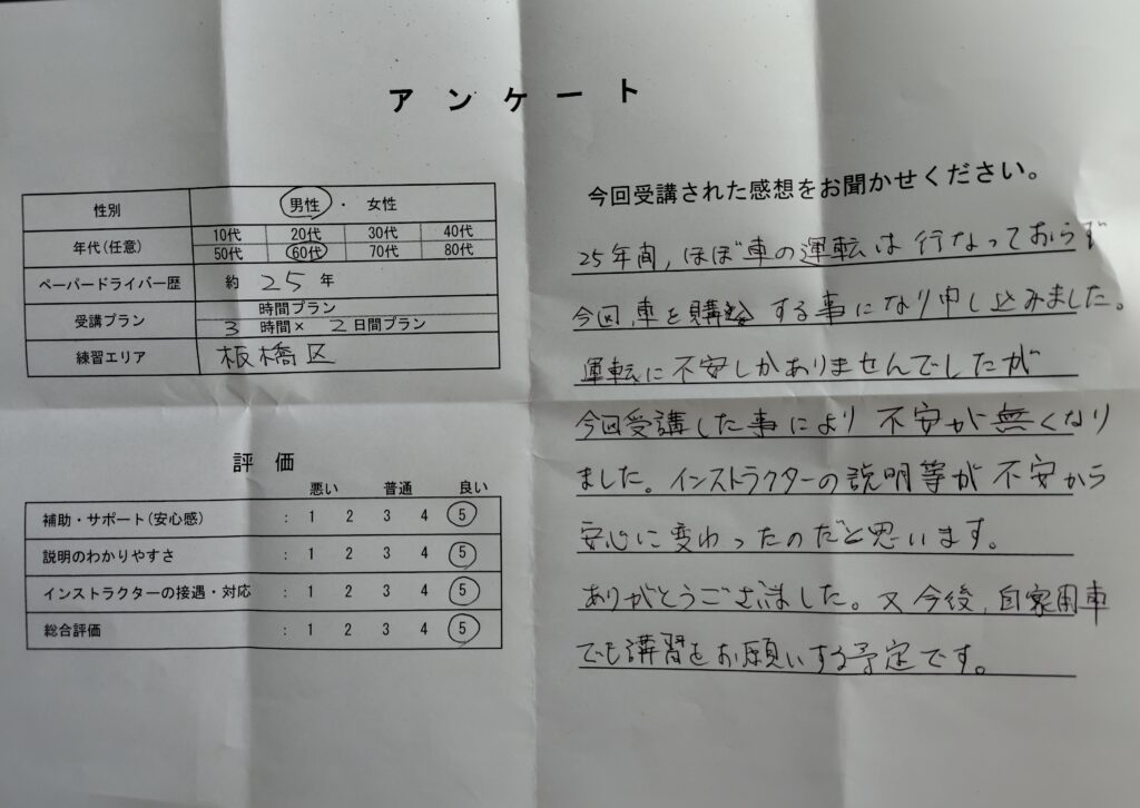 25年間、ほぼ車の運転は行っておらず、今回車を購入する事になり申し込みました。運転に不安しかありませんでしたが、今回受講した事により不安が無くなりました。インストラクターの説明等が不安から安心に変わったのだと思います。