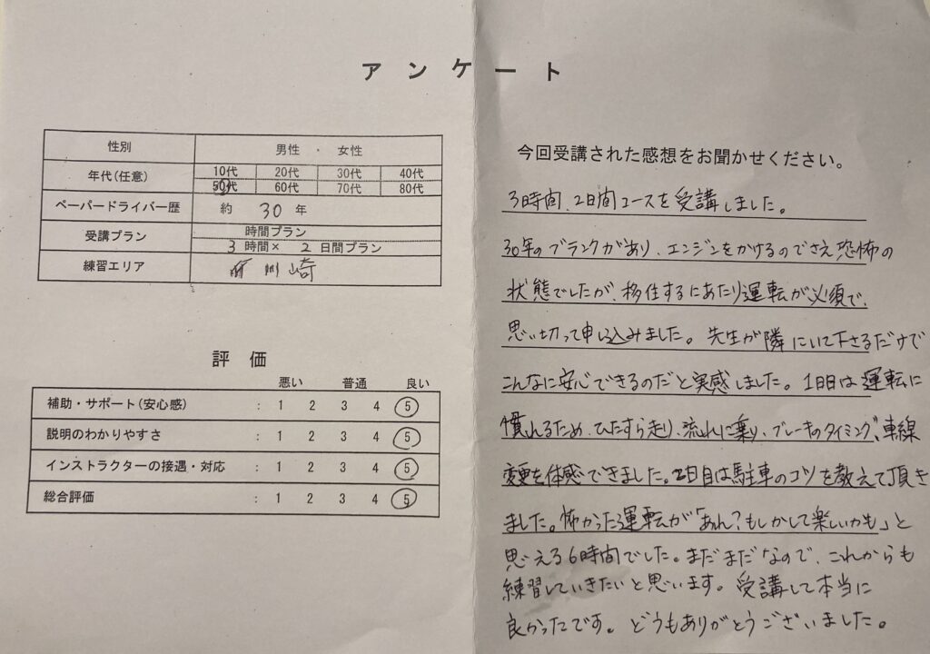 3時間×2日間コースを受講しました。30年のブランクがあり、エンジンをかけるのでさえ恐怖の状態でしたが、移住するにあたり運転が必須で思い切って申し込みました。