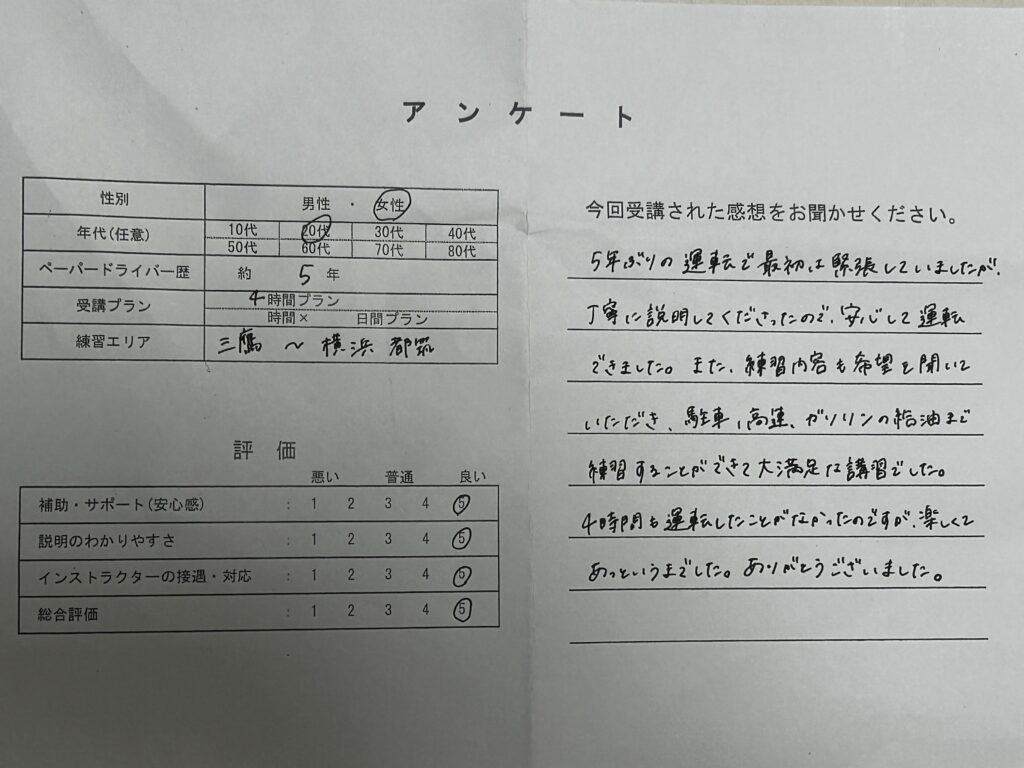 5年ぶりの運転で最初は緊張していましたが、丁寧に説明してくださったので、安心して運転できました。また、練習内容も希望を聞いていただき、駐車、高速、ガソリンの給油まで練習することができて大満足な講習でした。4時間も運転したことがなかったのですが、楽しくてあっという間でした。ありがとうございました。